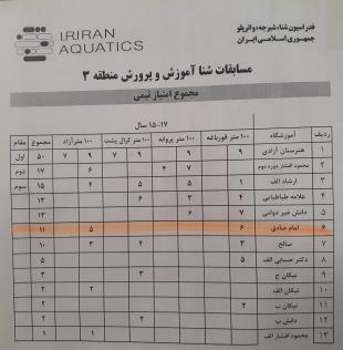 دبیرستان امام صادق (ع) در مسابقات شنای دانش آموزی در منطقه 3 ، رتبه ششم تیمی را کسب نموده است.